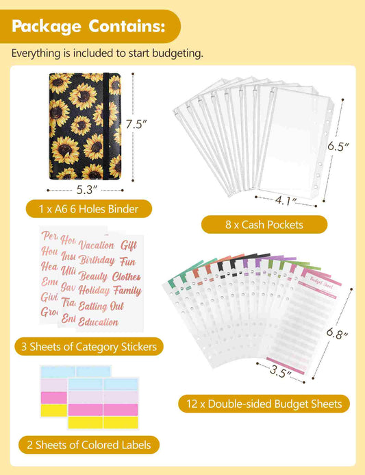 A6 Budget Binder for Money Saving Binder 8 Cash Pockets (Black Sunflower)