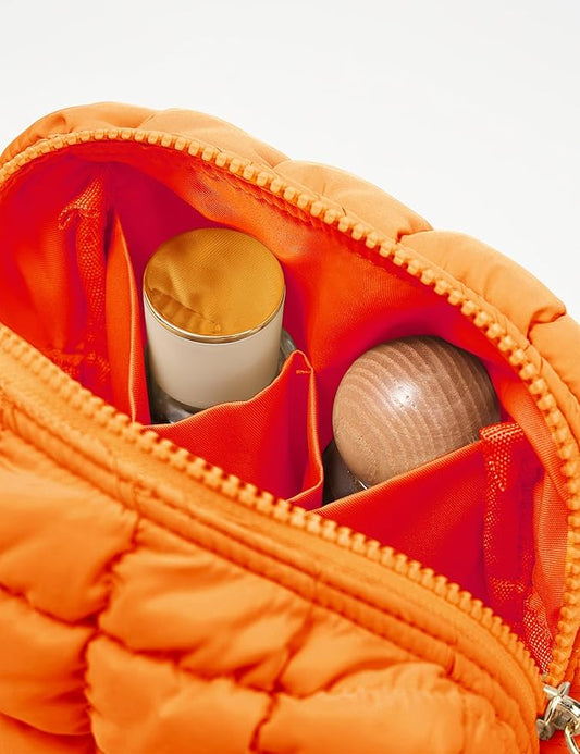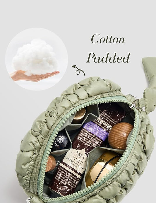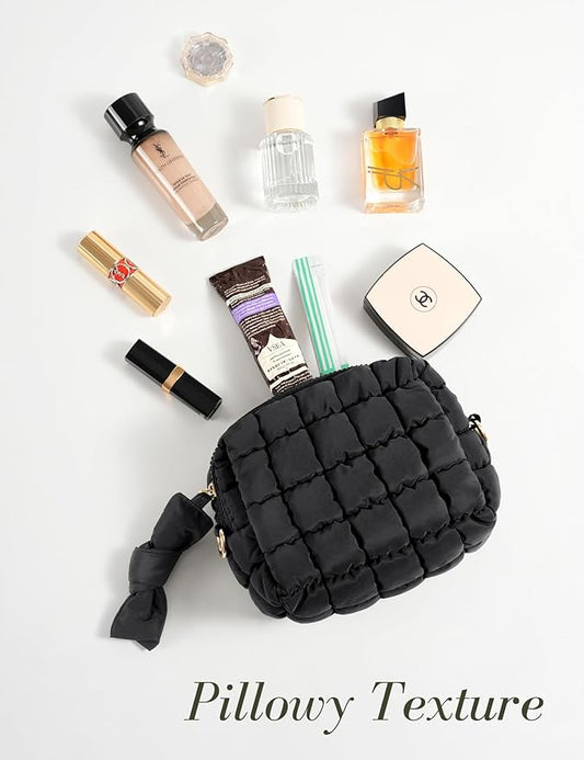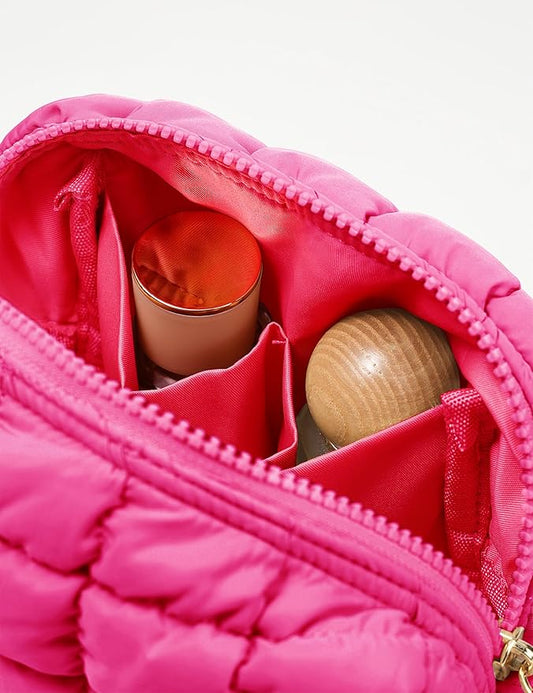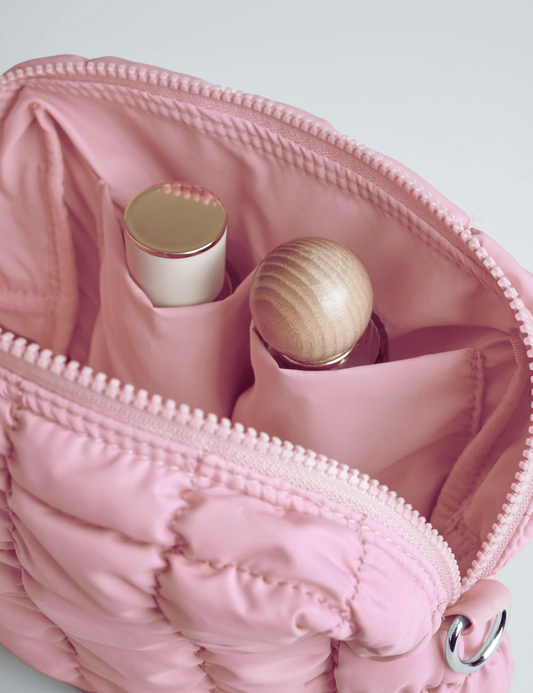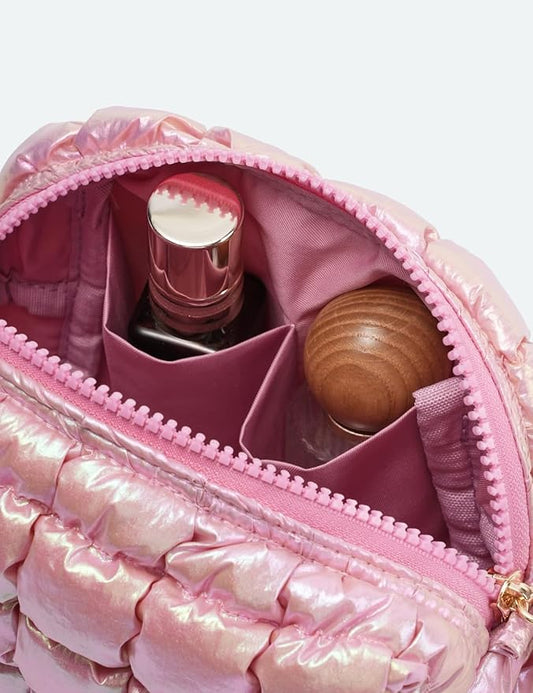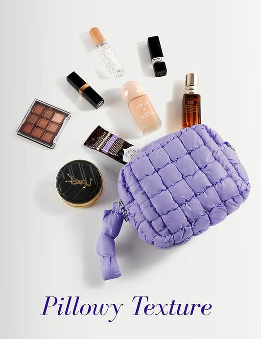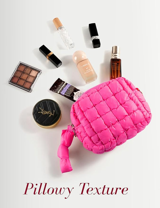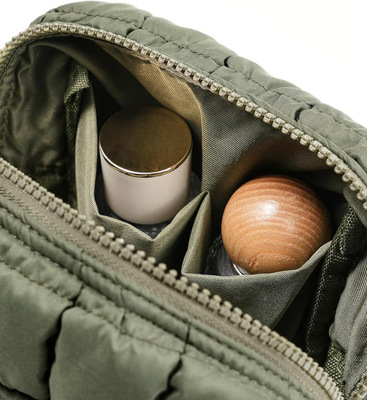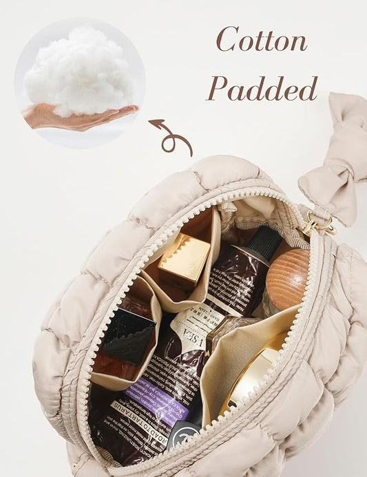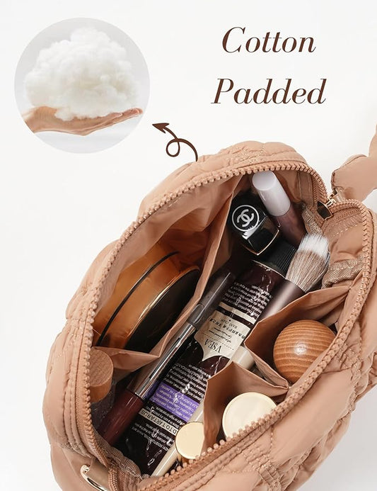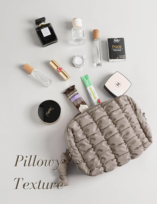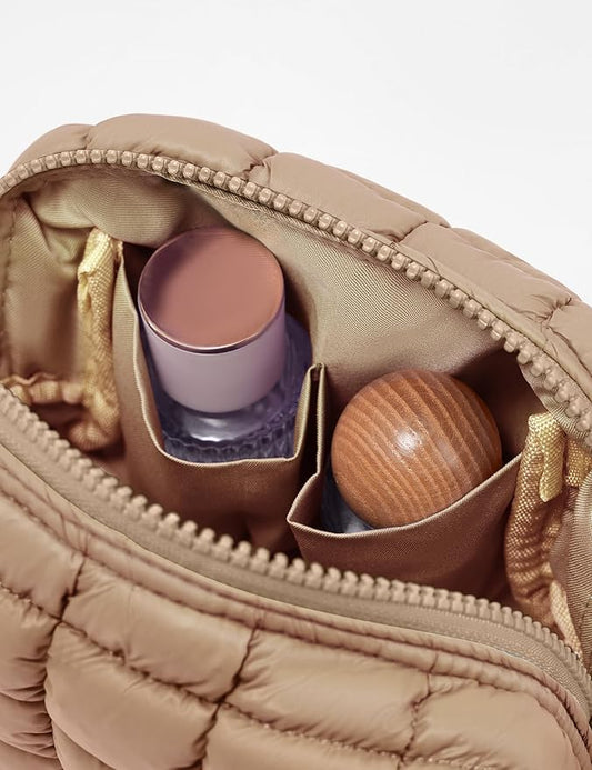 Taupe Quilted Makeup Bag – Travel Cosmetic Pouch for Purse & Toiletries