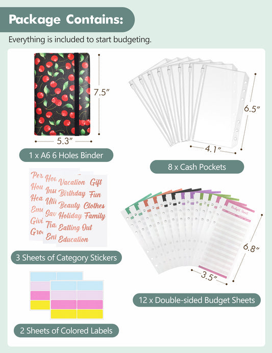A6 Budget Binder for Money Saving Binder 8 Cash Pockets (Red Cherry)
