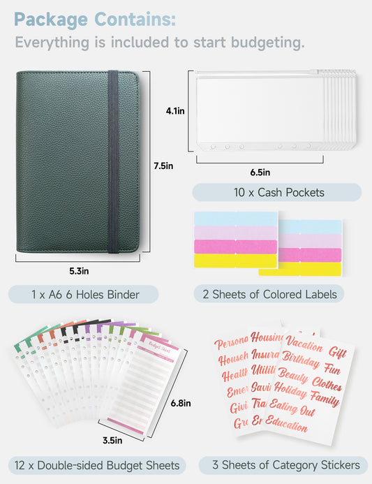A6 Budget Binder for Money Saving Binder 10 Cash Pockets (Grey Green)