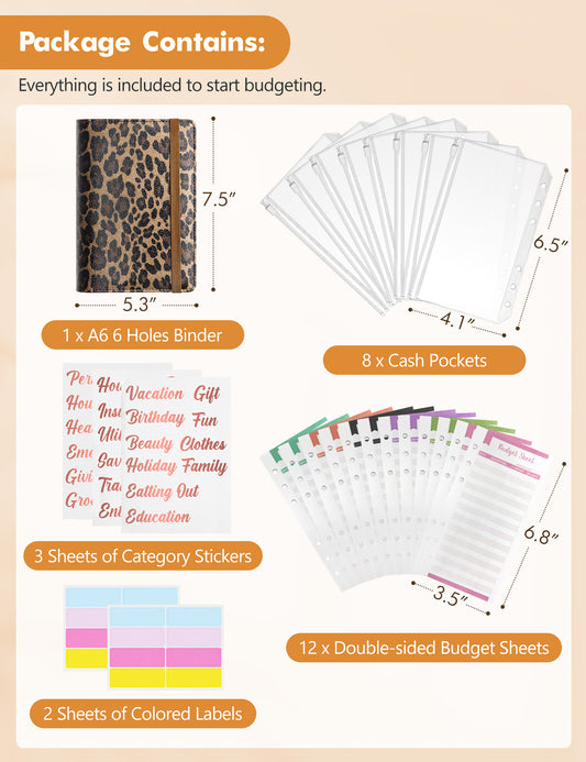 A6 Budget Binder for Money Saving Binder 8 Cash Pockets (Leopard)