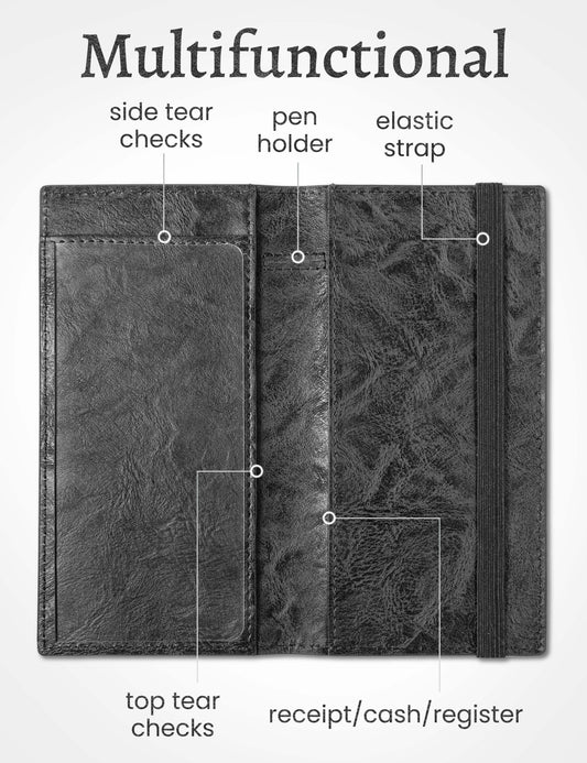 Checkbook covers for men & women with RFID blocking. Can be applied to top tear and side tear checks. Comes with 1 slide slot, 2 compartments, pen holder and an elastic closure strap. Keeps your checkbook, check register, cash and other personal identification documents safe and organized.