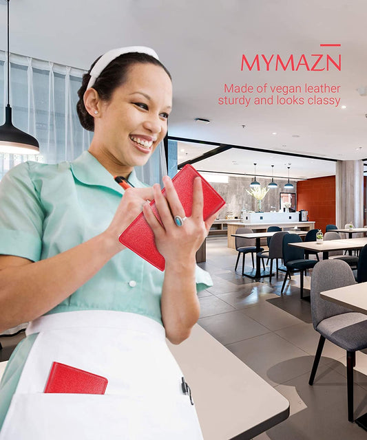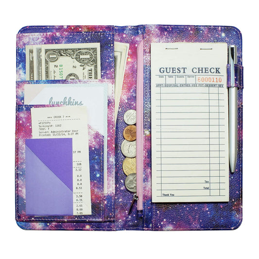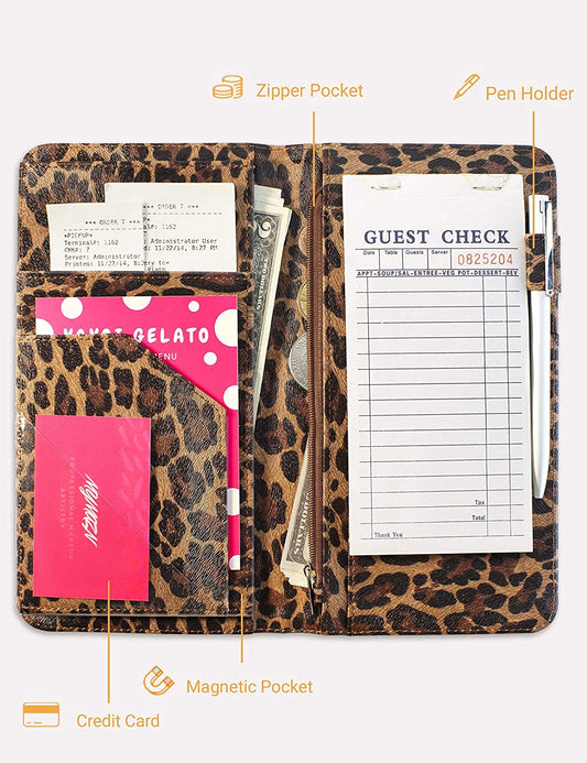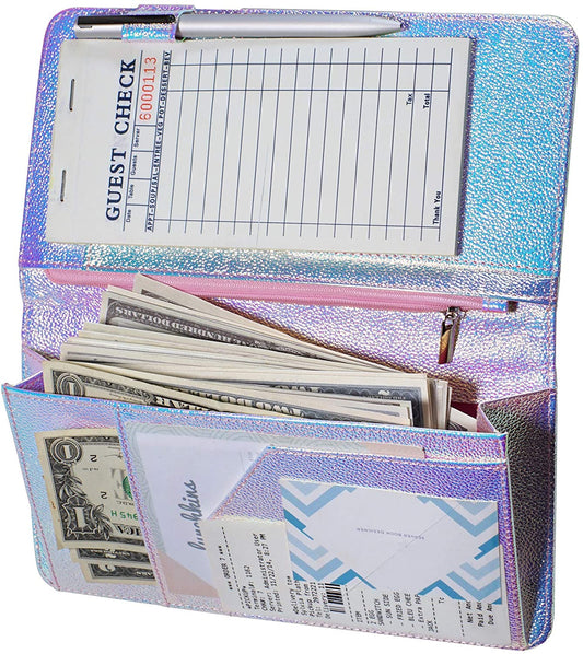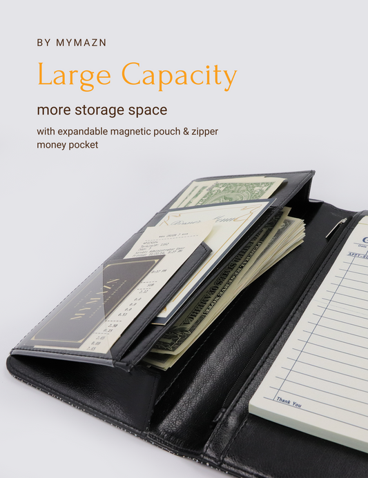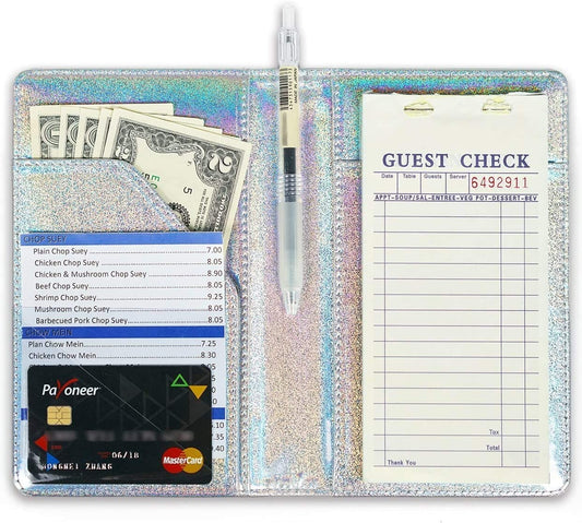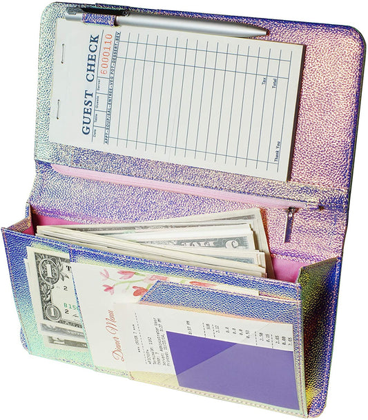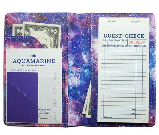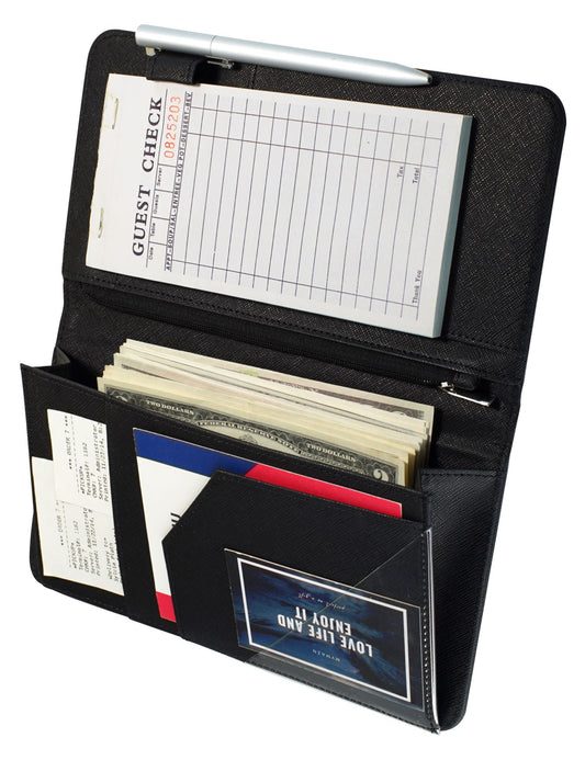 Server books for restaurant waitress and waiter. It holds a regular guest check book well and has ample space to keep cash, coins, note pads, pen, credit cards and menu specials. Thin, lightweight, and fits easily in the apron pocket.